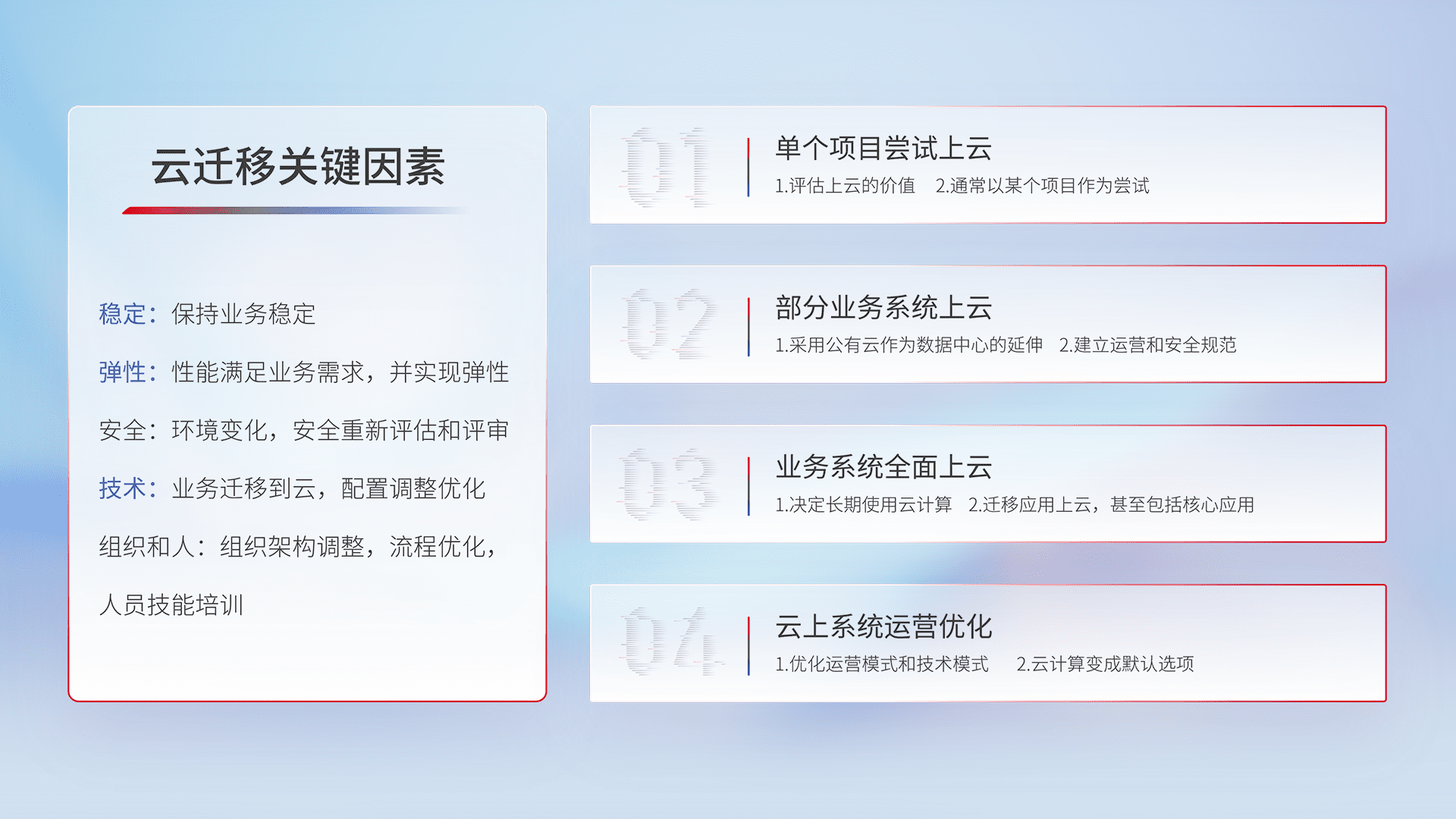 结合实际业务,,,从规划设计、、云平台选型、、、、云原生改造、、数据迁移、、、、集成交付,,,,迁移全过程为客户识别最佳上云路径,,做好风险识别管理,,,设计网络架构、、身份权限、、、、安全审计合规、、操作审计、、、日志审计、、监控告警策略、、、多站点容灾设计等,,,,对云上基础设施进行整体规划,,提升IT治理水平,,以满足弹性、、、、高可用、、、高性能的需求。。。